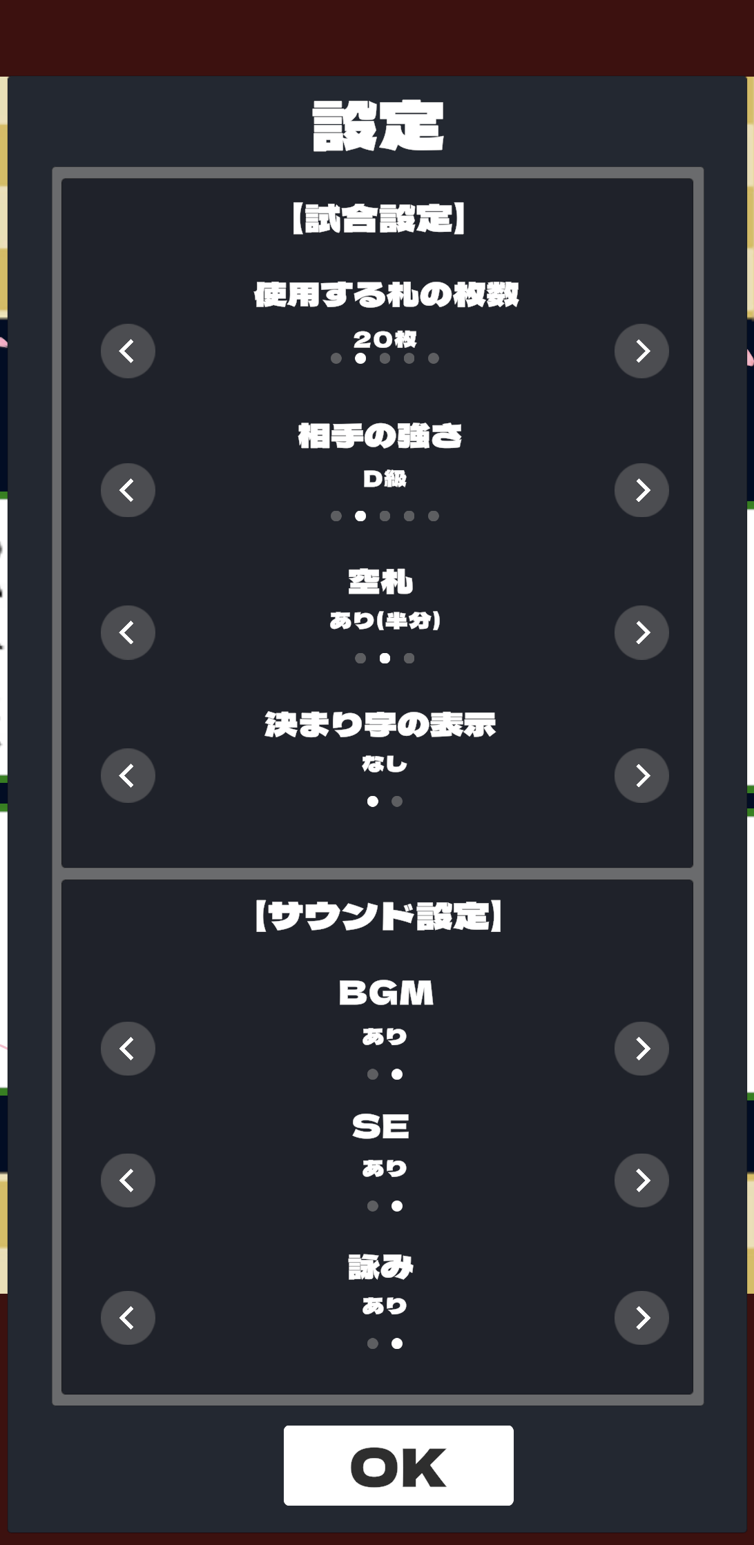 - お好みで使用する札の枚数と、コンピューターの強さを選択します。