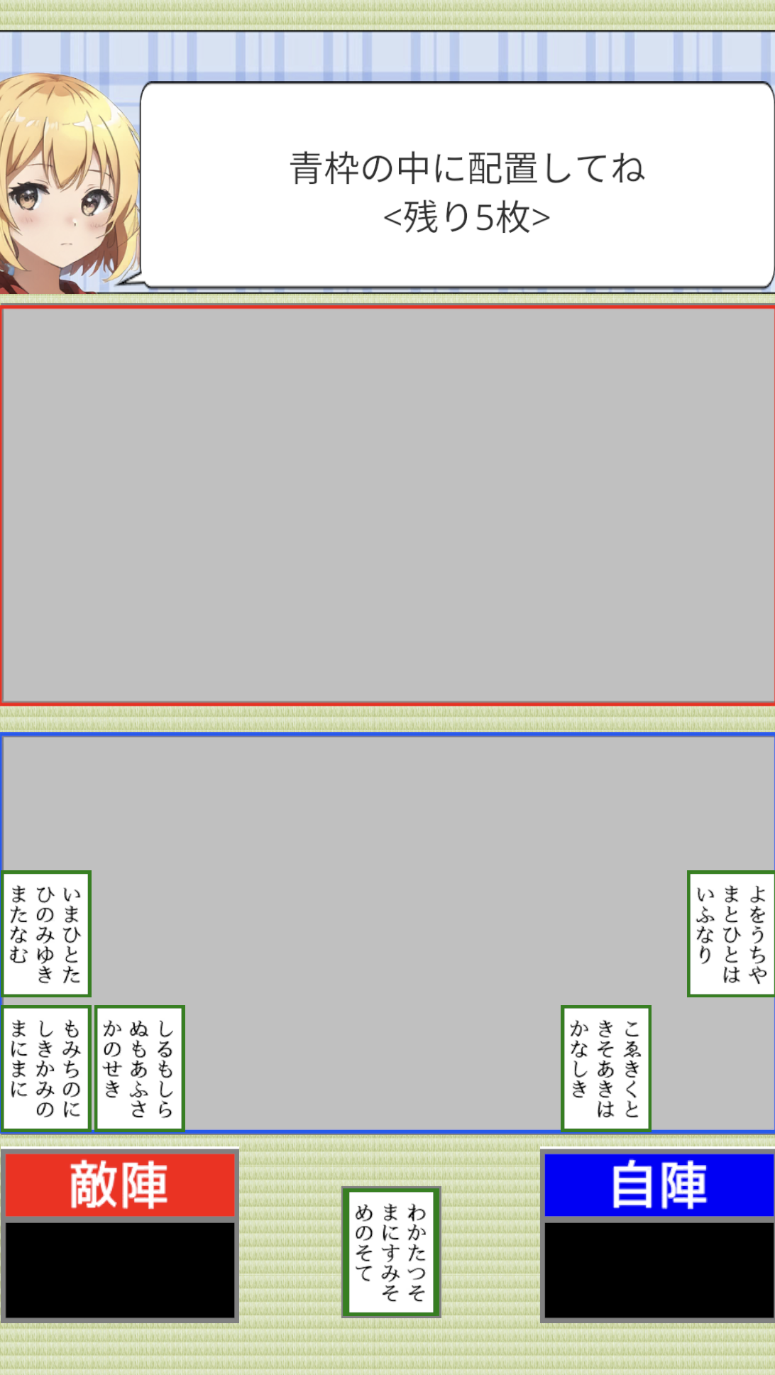 - 最初に自陣に札を並べます。持ち札を青枠の内側にスワイプさせ並べてください。