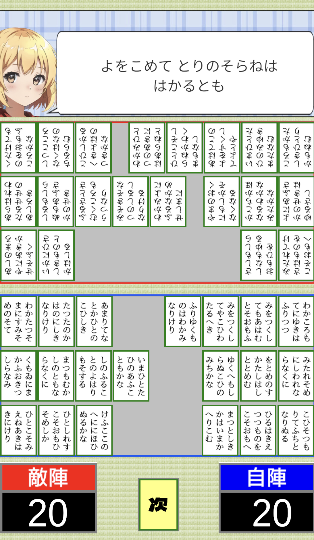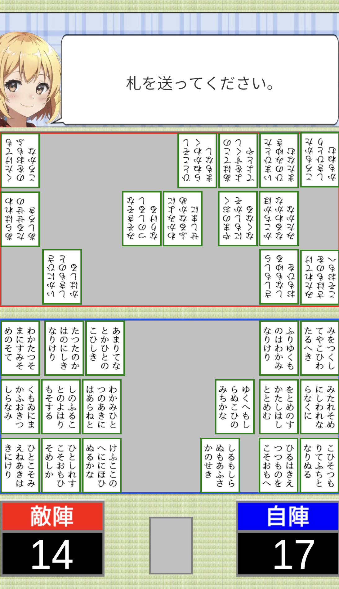 読まれた札をコンピュータより早く取ってください。 先に自陣の札がなくなった方が勝ちです