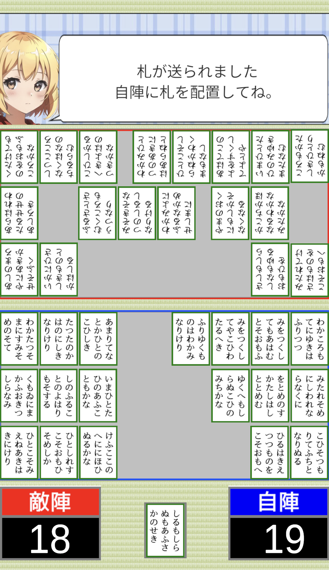 - 相手陣の札を取ったら、自陣の札を送ることができます。逆にコンピューターに自陣の札を取られると、相手陣から札が1枚送られてきますので、自陣に配置します。