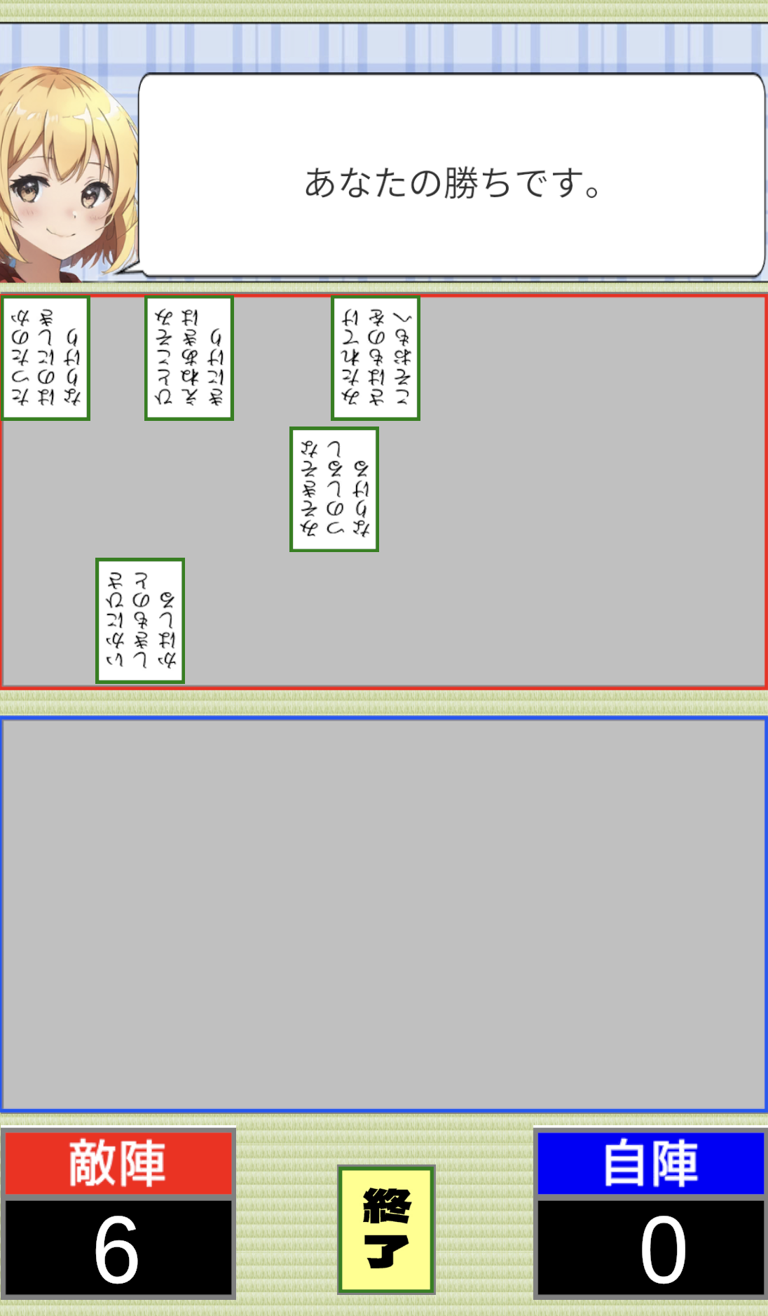 - 先に自陣の札がすべてなくなったら勝ちです。
